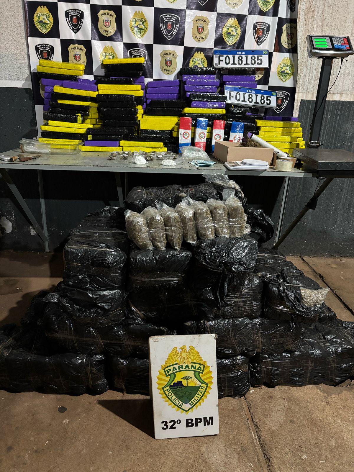 No interior do imóvel, os policiais encontraram a esposa do suspeito, uma mulher de 19 anos, além de um grande carregamento de entorpecentes. No total, foram apreendidos 260 kg de maconha e 68 gramas de cocaína, além de dinheiro em espécie. Também foram encontrados materiais utilizados na comercialização da droga, como uma balança de 150 kg, uma balança de precisão, embalagens diversas e quatro facas.