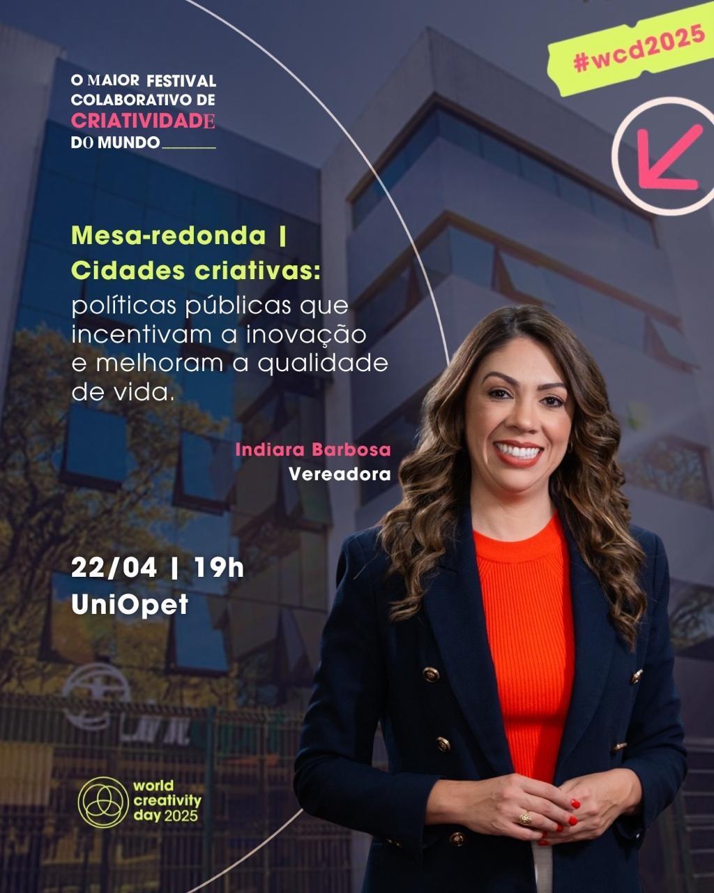A Vereadora Indiara Barbosa estará participando desta mesa-redonda, junto com deputados e com o meu colega de Bancada, Rodrigo Marcial. A ideia é debater políticas públicas que estimulam a inovação urbana, promovem inclusão social, fortalecem a economia criativa e melhoram a qualidade de vida da população. Da mobilidade inteligente ao acesso à cultura, como Curitiba pode se tornar um modelo de cidade criativa e inovadora?